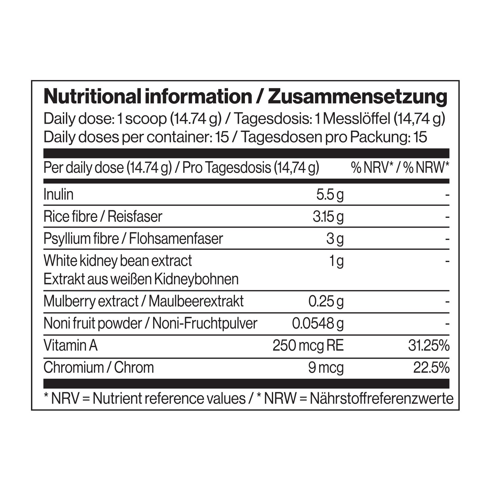 InhaltsstoffeInulin, Reisfaser (Oryza sativa L.), Flohsamenschalen (Plantago Ovata Forssk.), Extrakt aus weißen Kidneybohnen (Phaseolus vulgaris), Mangosaftpulver (Mangifera indica L.), Aroma, Karottenpulver (Daucus carota L.), Säureregulator (Zitronensäure), Maulbeerextrakt (Morus alba L.), Haferkleie (Avena sativa L.), Vitamin A (Beta-Carotin), Süßungsmittel (Steviolglykoside aus Stevia), Noni-Fruchtpulver, Chrompicolinat.