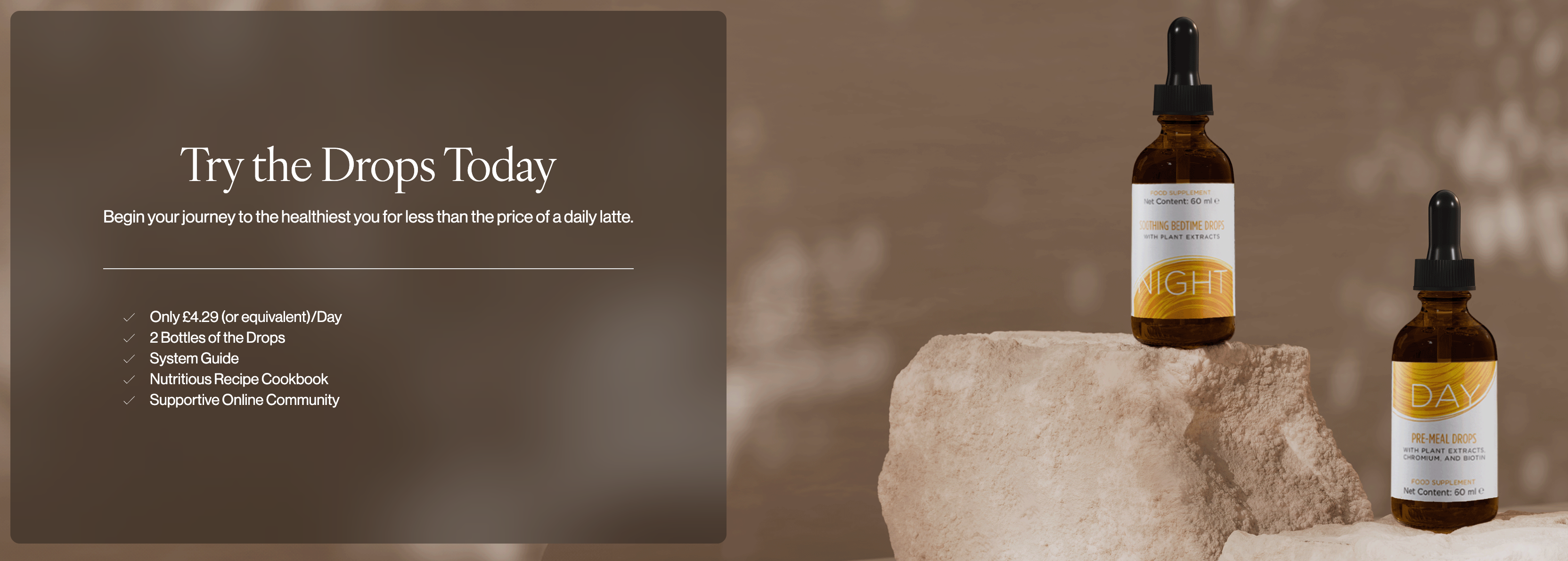 - Day Drops: Water, humectants (glycerol), white kidney bean extract (Phaseolus vulgaris), sweetener (erythritol), cocoa bean extract (Theobroma cacao), natural flavouring, green coffee bean extract (Coffea arabica), acidity regulator (citric acid), green tea leaf extract (Camellia sinensis), guarana seed extract (Paullinia cupana), cinnamon bark extract (Cinnamomum cassia), preservative (potassium sorbate), D-biotin, chromium (III) chloride, sweetener (steviol glycosides from stevia).
