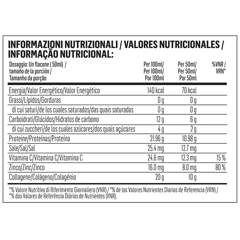 Agua, colágeno ( pescado) 17,5%, concentrado de los frutos de Morinda citrifolia 16,4%, jugo de manzana de concentrado, potenciador de sabor (eritritol), ácido cítrico, gluconato de zinc, ácido ascórbico (vitamina C), maltodextrina, edulcorante (glicósido de esteviol), sabores naturales, zumo de arándano en polvo (Vaccinium corymbosum), extracto de hoja de Cynara scolymus (alcachofa), extracto de Citrus sinensis (naranja roja), extracto de oliva (Olea europaea).
