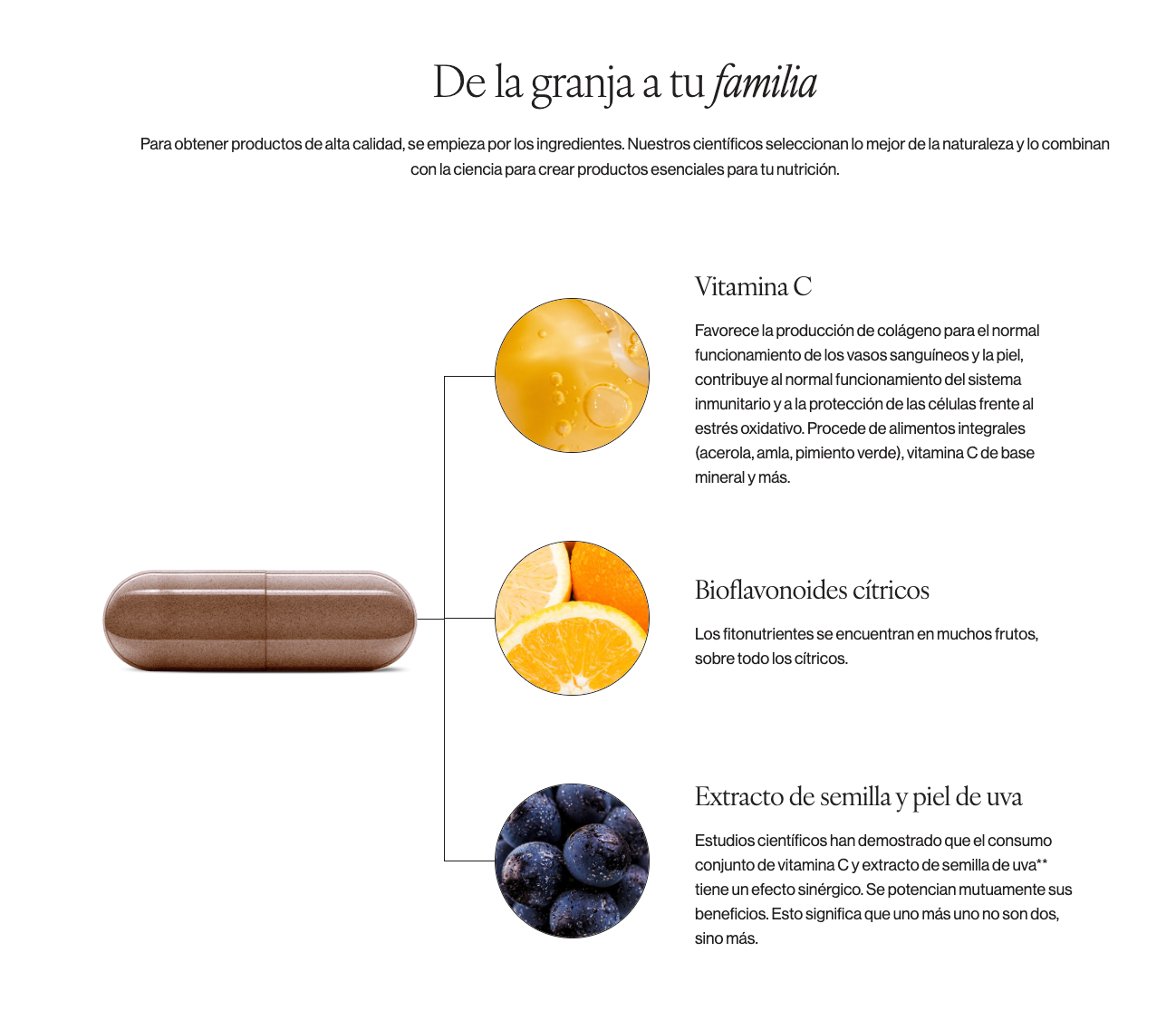 - Vitamina C (con ascorbato de calcio, extracto de acerola, extracto de amla, extracto de pimiento verde (Capsicum annuum L.), palmitato de L-ascorbilo)