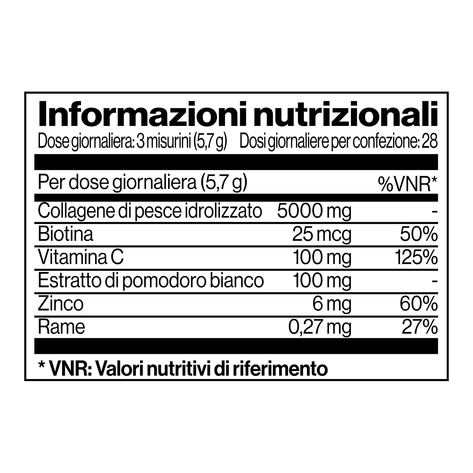 Stiamo ridefinendo il concetto di cura della pelle con ingredienti che vanno oltre la superficie. Collagene di pesce idrolizzato, aroma, aroma, vitamina C (L-ascorbato di calcio), estratto di pomodoro bianco (Solanum lycopersicum, frutto), edulcorante (glicosidi steviolici da Stevia), addensante (gomma di xanthan), zinco (gluconato di zinco), aroma, rame (gluconato di rame), biotina (D-biotina).