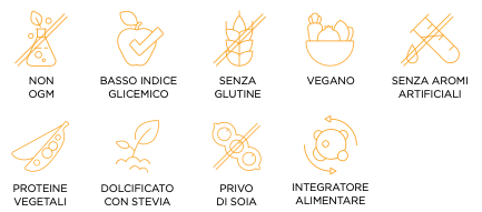 Isolato proteico di pisello fruttoligosaccaridi, aroma, emulsionante (lecitina), olio derivato dalla microalga Schizochytrium sp., addensante (gomma di xanthan, gomma di guar), miscela di vitamine e minerali [L-ascorbato di calcio, gluconate di zinco, D-biotina, acetato di D-alfa-tocoferile, nicotinamide, D-pantotenato di calcio, colecalciferolo, riboflavina, piridossina, cloridrato di tiamina, beta carotene, picolinato di cromo, ioduro di potassio], cacao magro in polvere (Theobroma cacao, seme), ossido di magnesio, edulcorante (glicosidi steviolici), olio di cocco in polvere (Cocos nucifera, frutto), sali di calcio dell'acido ortofosforico, miscela enzimatica [alfa-amilasi, proteasi neutrale, lattasi, lipasi, cellulasi, maltodestrina], crusca di riso (Oryza sativa, frutto), colorante (caroteni), polvere di mirtillo rosso (Vaccinium macrocarpon, frutto), l-triptofano, Lactobacillus plantarum.