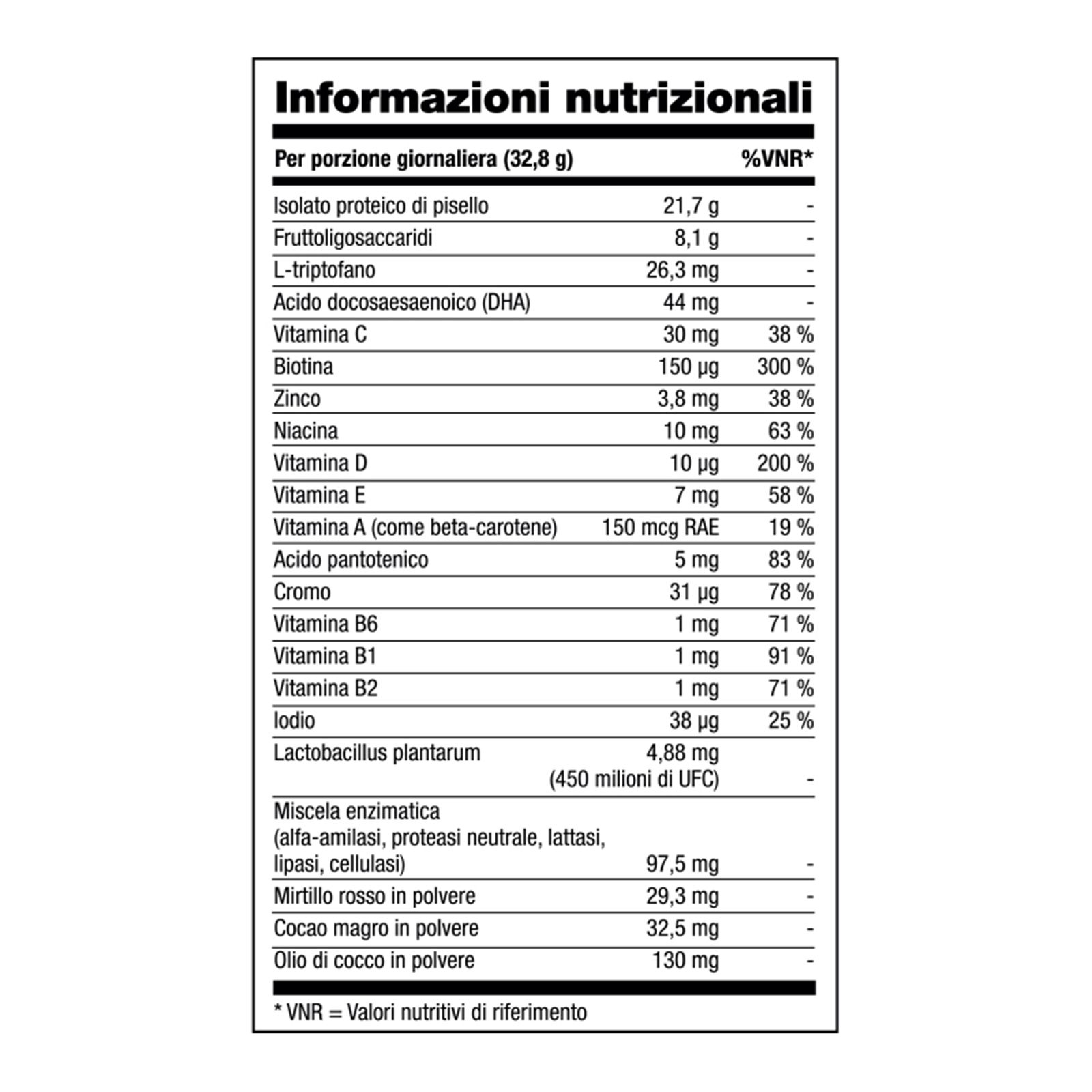 Isolato proteico di pisello, fruttoligosaccaridi, aroma, emulsionante (lecitine), olio derivato dalla microalga Schizochytrium sp., bisglicinato di magnesio, addensante (gomma di guar), olio di cocco in polvere (Cocos nucifera, seme), miscela enzimatica (alfa-amilasi, proteasi neutrale, lattasi, lipasi, cellulasi), aroma, edulcorante (glicosidi steviolici da Stevia), sali di calcio dell’acido ortofosforico, vitamina C (L-ascorbato di calcio), cacao magro in polvere (Theobroma cacao, seme), addensante (gomma di xanthan), polvere di mirtillo rosso (Vaccinium macrocarpon, frutto), gluconato di zinco, L-triptofano, biotina (D-biotina), vitamina E (DL-alfa-tocoferolo), niacina (nicotinamide), acido pantotenico (D-pantotenato, calcio), Lactobacillus plantarum, vitamina A (beta-carotene), vitamina D (colecalciferolo), vitamina B6 (cloridrato di piridossina), vitamina B1 (cloridrato di tiamina), vitamina B2 (riboflavina), ioduro di potassio, picolinato di cromo.