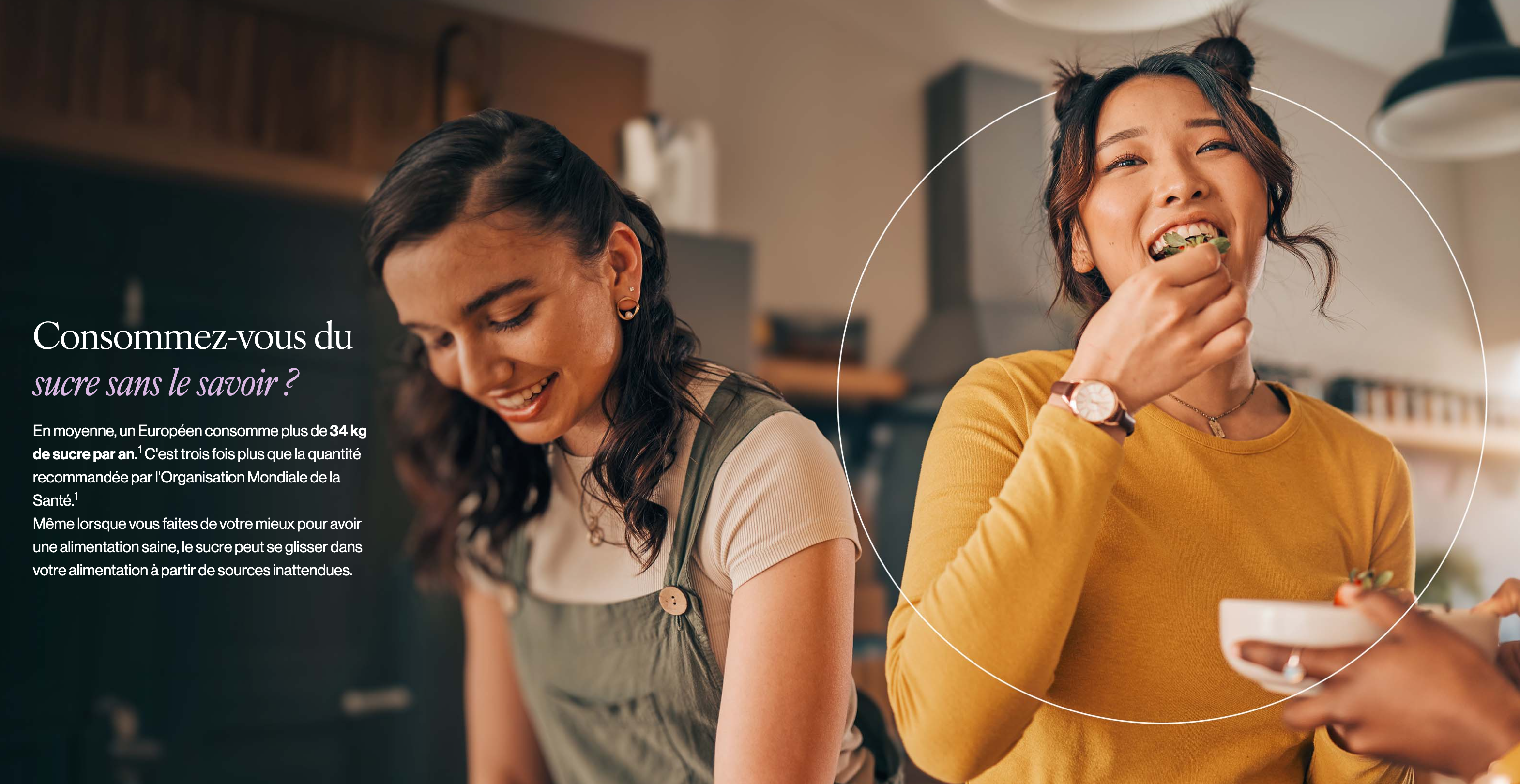 Inuline, fibre de riz (Oryza sativa L.), fibre de psyllium (Plantago Ovata Forssk.), extrait de haricot blanc (Phaseolus vulgaris), poudre de jus de mangue (Mangifera indica L.), arôme, poudre de carotte (Daucus carota L.), régulateur d'acidité (acide citrique), extrait de mûrier (Morus alba L.), son d'avoine (Avena sativa L.), vitamine A (bêta-carotène), édulcorant (glycosides de stéviol issus de Stevia), poudre de fruit de noni, picolinate de chrome.