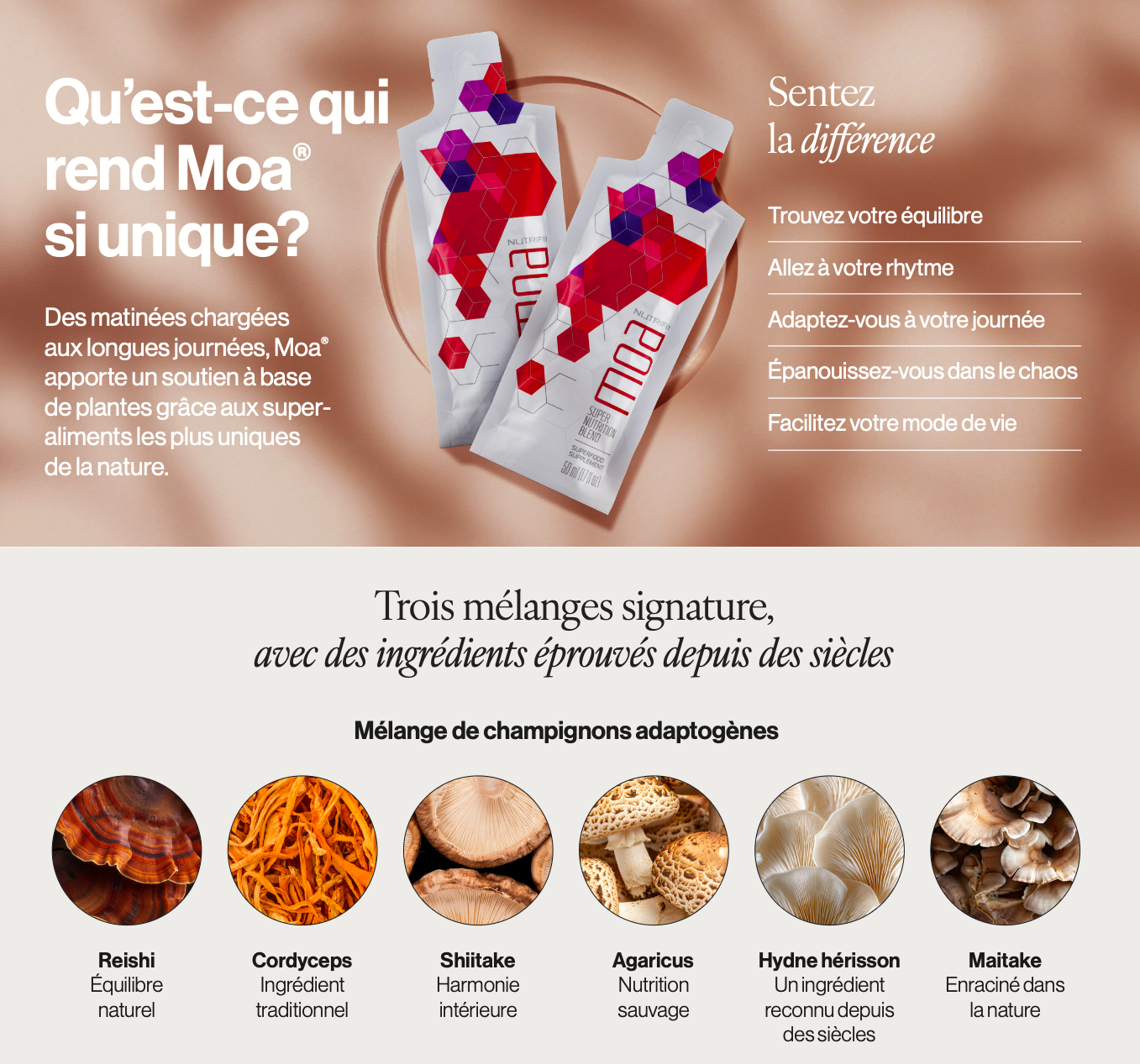 Pendant des siècles, les champignons ont été utilisés pour produire des bienfaits pour la santé en termes d'immunité, d'énergie et de longévité. La liste des super ingrédients de Moa contient un complexe de champignons revitalisant, dont le maitake (gramme pour gramme, plus précieux que l'or), les graines de nigelle et la bergamote, qui travaillent tous ensemble pour amplifier le système immunitaire de votre corps afin d'atteindre la force d'un super-héros.