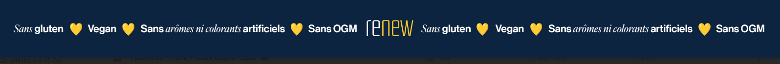 Correcteur d’acidité (acide citrique), L-citrulline, L-lysine chlorhydrate, L-arginine, GABA (acide gamma-aminobutyrique), oxyde de magnésium, correcteur d’acidité (acide malique), arôme, édulcorant (glycosides de stéviol issus de stevia), arôme, poudre de noni (Morinda citrifolia), couleur alimentaire (concentré de patate douce (Ipomea batatas), concentré de radis (Raphanus sativus), concentré de cerise (Prunus cerasus), concentré de pomme (Malus domestica)), arôme, citrate de zinc, bêta-alanine, arôme, extrait de graine de raisin (Vitis vinifera L.), L-sélénométhionine, extrait de rhizome de curcuma (Curcuma longa L.), extrait de fruit de myrtille (Vaccinium myrtillus), niacine (nicotinamide), poudre de fruit de mûre (Rubus fruticosus), vitamine B6 (chlorhydrate de pyridoxine), niacine (acide nicotinique), extrait de fruit d'acérola (Malpighia glabra), vitamine A (béta-carotène), lutéine, chlorure de chrome (III), zéaxanthine, vitamine B12 (méthylcobalamine).
