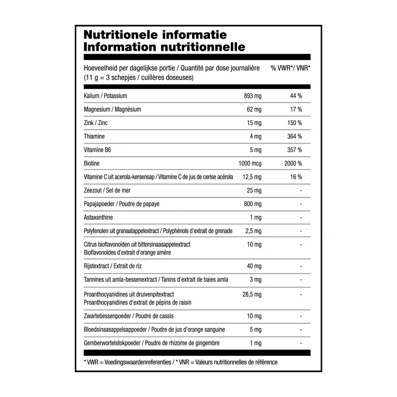 Zoetstof (erytritol), vitaminen-mineralenmengsel (kaliumcitraat, rode zeewierpoeder (Lithothamnium calcareum), magnesiumzouten van citroenzuur, calciumzouten van citroenzuur, zinkcitraat, zeezout, pyridoxinehydrochloride, thiaminehydrochloride), papajapoeder (Carica papaya L. ), zuurteregelaar (citroenzuur), natuurlijke aroma's, d-biotine, zoetstof (steviolglycosiden uit stevia), extract van acerola-kersensap (Malpighia glabra), rijstextract (Oryza sativa), druivenpitextract (Vitis vinifera L.), bittersinaasappelextract (Citrus aurantium), amla-bessenextract (Emblica officinalis), astaxanthine, zwartebessenpoeder (Ribes nigrum L.), granaatappelextract (Punica granatum L.), bloedsinaasappelsappoeder (Citrus x sinensis), gemberwortelstokpoeder (Zingiber officinale).