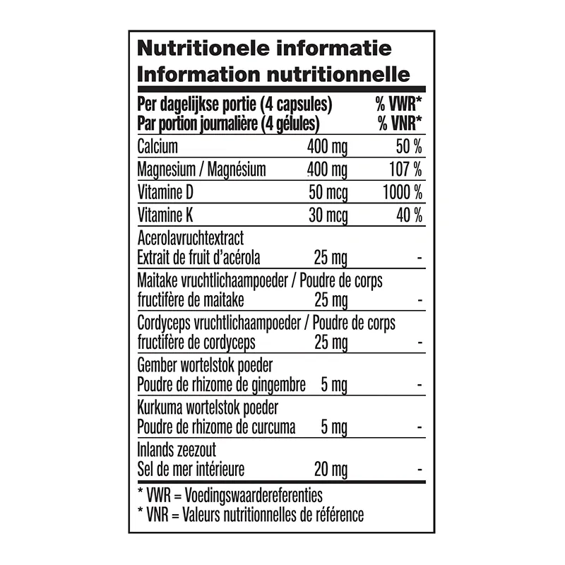 Calciumzouten van citroenzuur, magnesiumoxide, stabilisator (hydroxypropylmethylcellulose), acerolavruchtextract (Malpighia glabra), maitake vruchtlichaampoeder (Grifola frondosa), cordyceps vruchtlichaampoeder (Cordyceps sinensis), cholecalciferol (vitamine D3), inlands zeezout, emulgator (lecithinen), gember wortelstok poeder (Zingiber officinale), kurkuma wortelstok poeder (Curcuma longa), rijstzemelen (Oryza sativa), menachinon (vitamine K2), antiklontermiddel (siliciumdioxide).