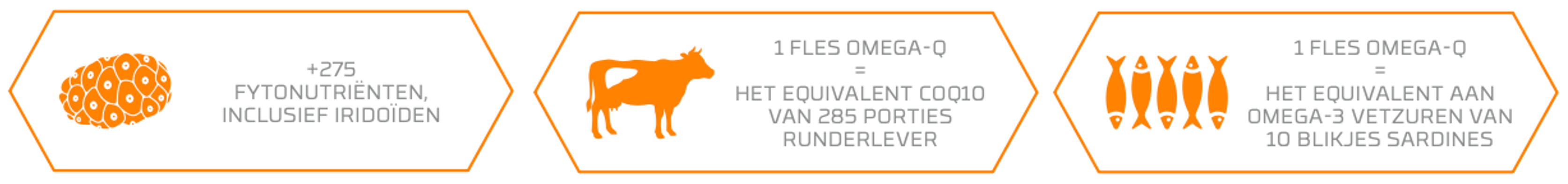 Omega-Q™ is een uniek mengsel van essentiële omega-vetzuren en co-enzym Q10 (CoQ10). Omega-3 verzuren EHA en DHA hebben een gunstige werking op het hart. Dit gunstige effect wordt verkregen bij een dagelijkse inname van 250 mg EPA en DHA.