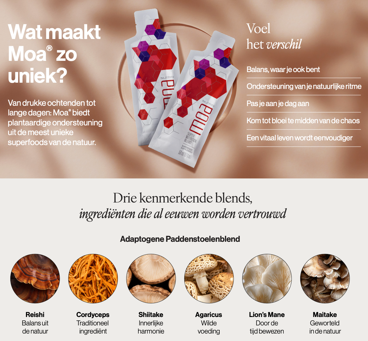 Met behulp van exotische ingrediënten van over de hele wereld, biedt Moa het beste van wat Moeder Natuur te bieden heeft, allemaal thuisbezorgd. Veel van de ingrediënten van Moa worden al eeuwenlang gebruikt door oude beschavingen in culturen die welzijn waarderen.