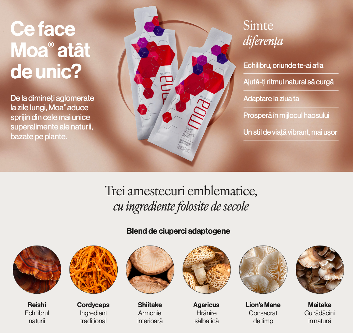 Ciupercile sunt folosite de secole pentru a produce beneficii asupra sănătății imunității, energiei și a longevității. Lista de ingrediente senzaționale a produsului Moa conține un complex revigorant de ciuperci, inclusiv „aur” maitake - a cărei uncie este mai valoroasă decât aurul, semințe de chimen negru și bergamotă, care împreună contribuie la întărirea sistemului imunitar al organismului pentru ca dumneavoastră să puteți rivaliza cu puterea supereroilor!