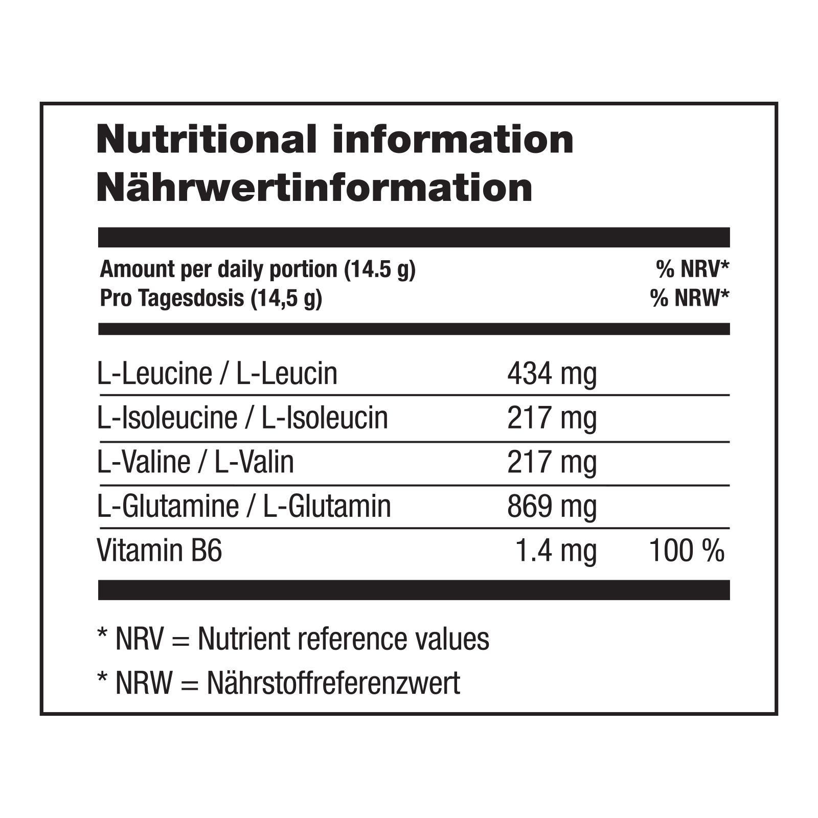 Cocoa powder (36%) (Theobroma Cacao), coconut milk powder (Cocos Nucifera), coconut oil powder (Cocos Nucifera), sweetener (xylitol), branched chain amino acid blend (L-leucine, L-isoleucine, L-valine), L-glutamine, medium chain triglycerides powder, natural flavourings, emulsifier (sunflower lecithin), thickening agents (guar gum, xanthan gum), sweetener (steviol glycosides from Stevia), salt (sodium chloride), pyridoxine HCI.